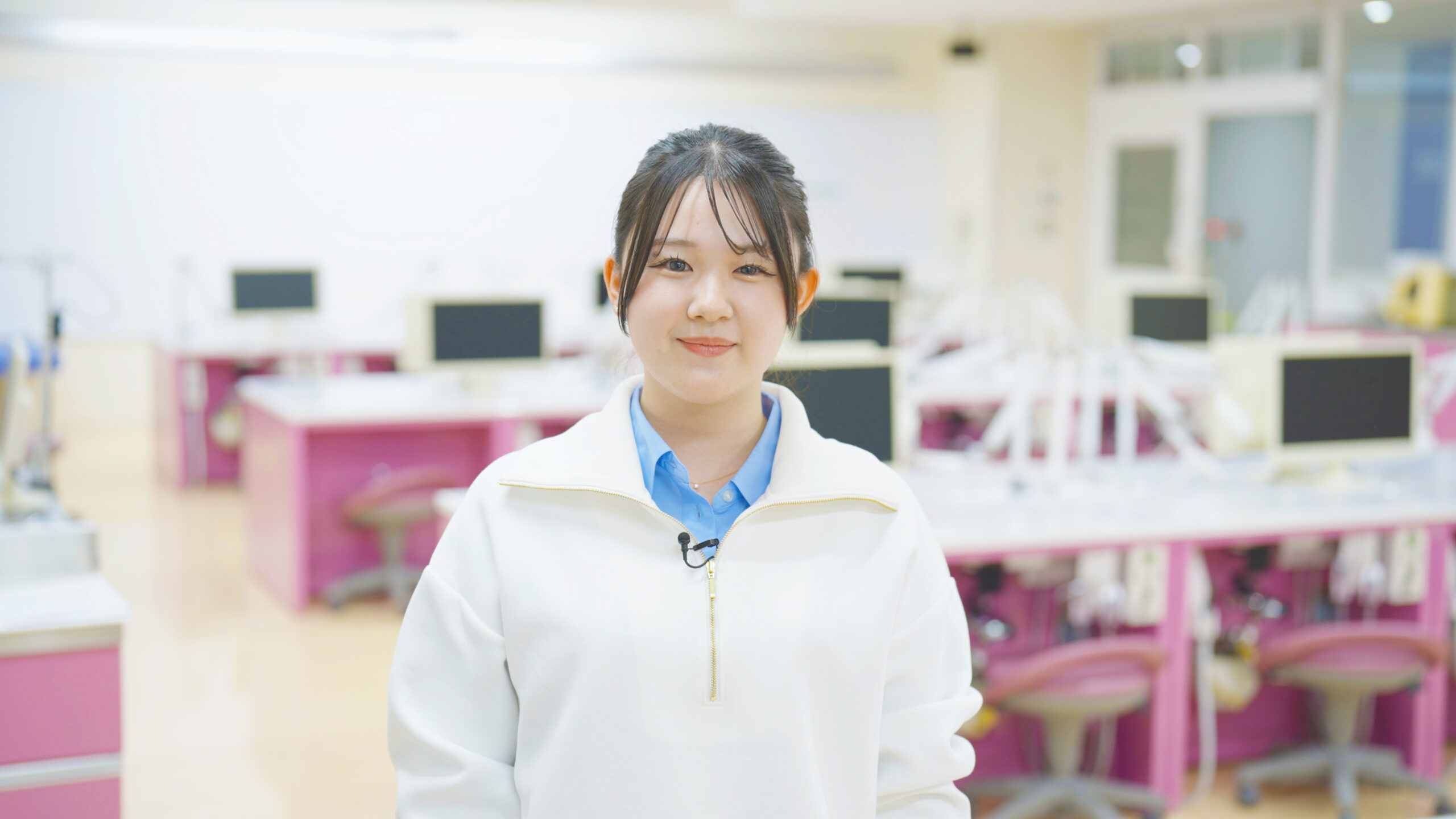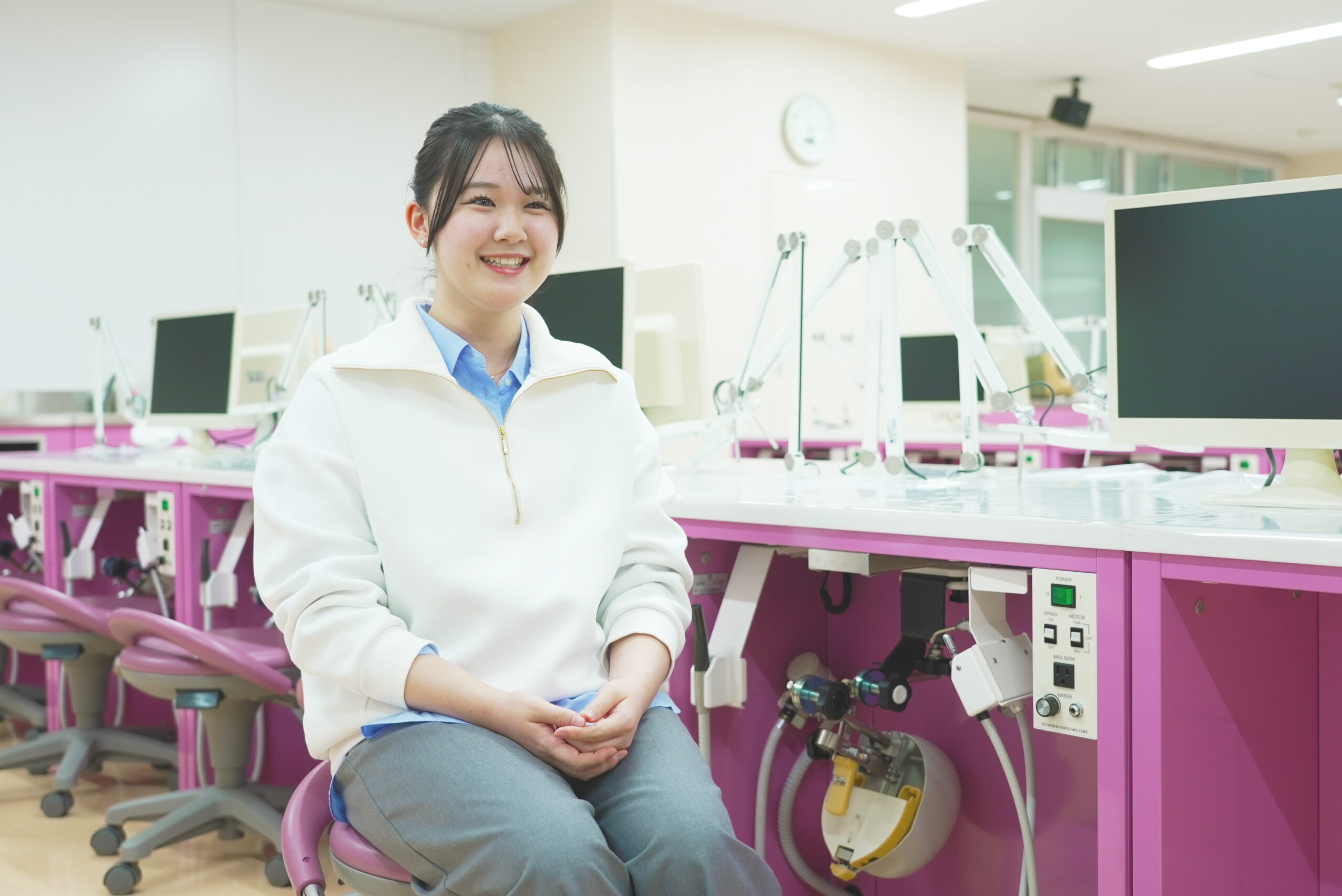 実習が多いところです。一年生から、実際に歯科医院に行って実習する機会があって、バキュームやセメントを練ったりさせていただきました。学校でしっかり学んだので、不安なく自信持って患者さんに接することができました。