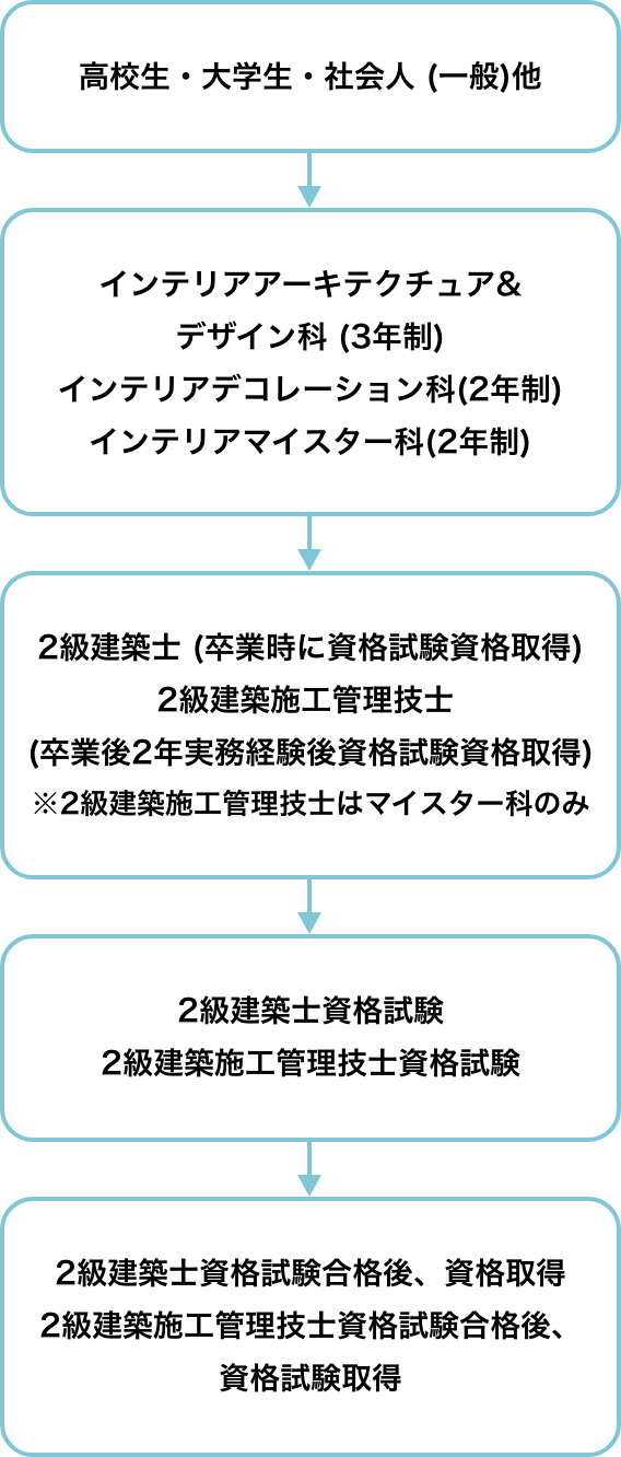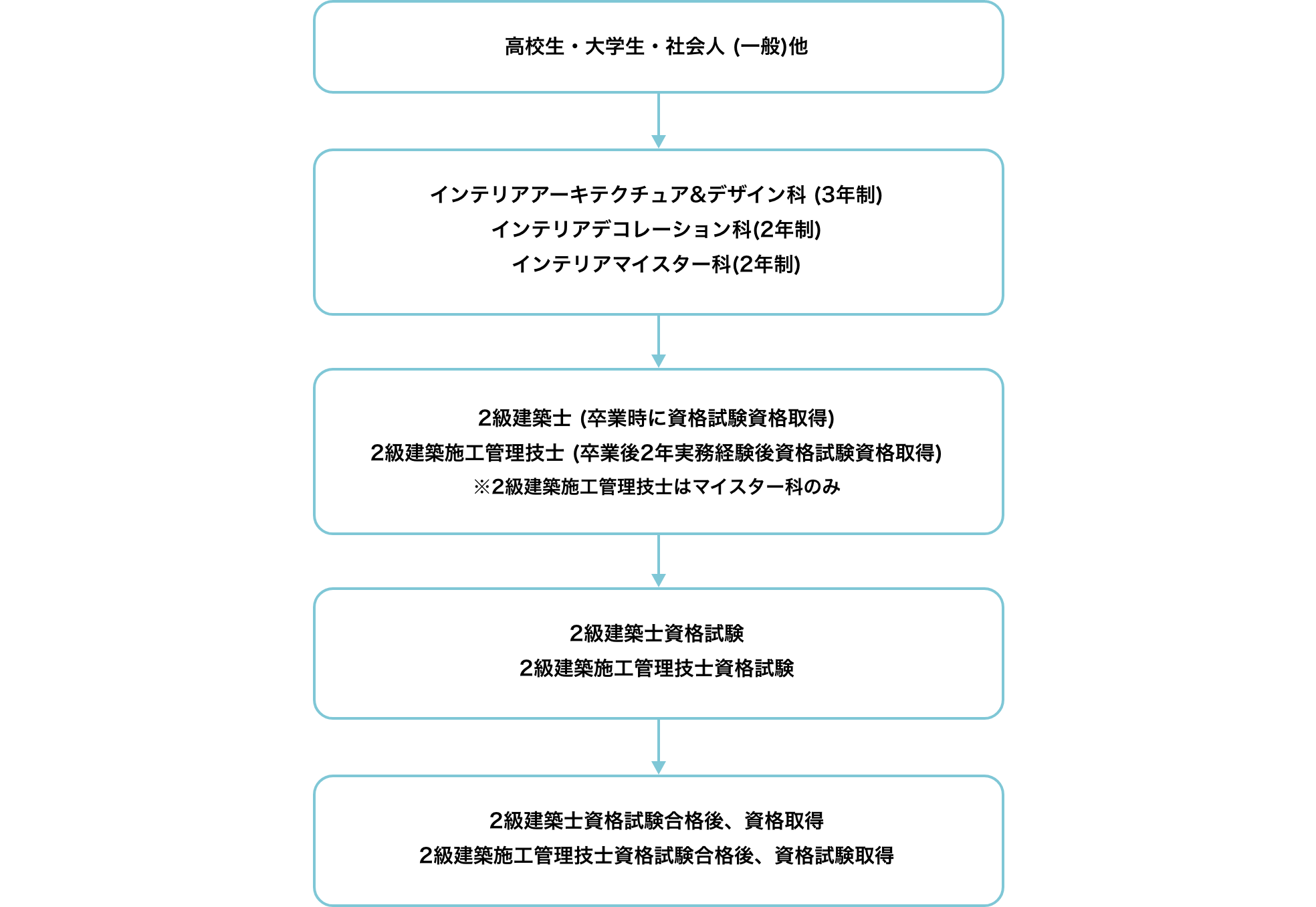 インテリアや建築の専門家を目指す過程として、実際にデザイナーや建築家として仕事をしている専門家との一対一でのチュートリアル(個別指導)を行い、実践的かつ学生一人一人の個性や才能を伸ばす授業を展開しています。2級建築士やインテリアコーディネーターの資格取得につながる、色彩感覚などを養う実習授業や、建築構造に関しての専門的な知識を得られる座学、素材を知るためのショールームやギャラリーへの校外見学・研修などを行なっています。知識として学ぶだけでなく職人育成として技術の習得にも力を入れているため、校内に木造の小屋を一軒建てるための空間を設け、まずは解体、そして基礎から屋根の仕上げ、さらに内装の仕上げ、電気設備に至るまで建物一つを作り上げる実習も行なっています。